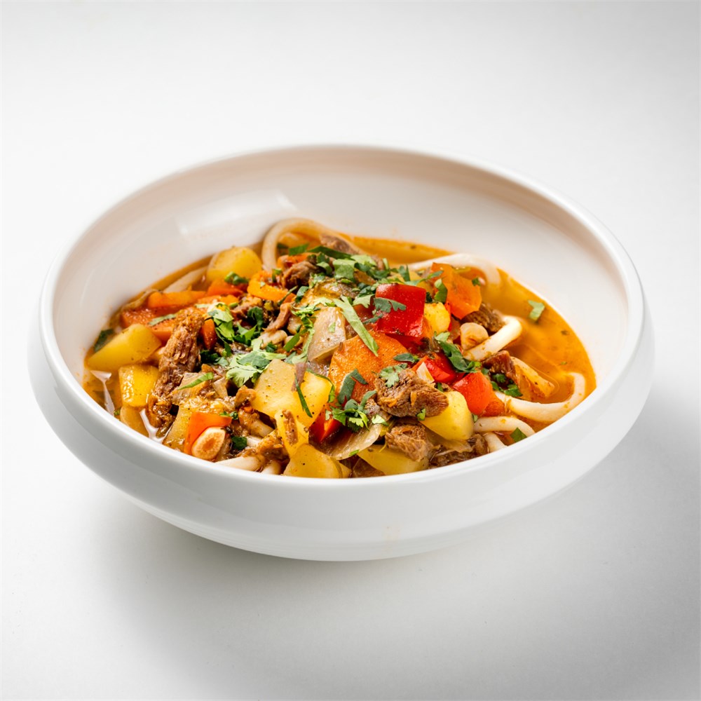 Лапша лагман и сочная оленина тают во рту! Картофель и морковь добавляют сытности, а томатная паста наполняет блюдо насыщенным вкусом. Редис и чеснок придают пикантность, а кинза завершает композицию свежестью. Это блюдо — настоящий праздник для гурманов!
