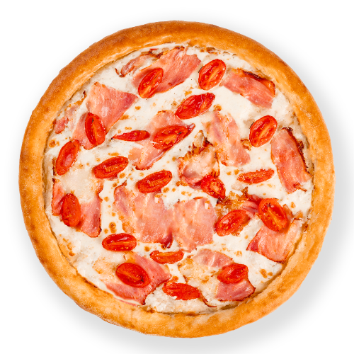 Любимая Карбонара — нежное тесто, тягучая моцарелла, сливочный сметанный соус, хрустящий бекон, зрелый пармезан, сочные помидоры черри и ароматные итальянские специи. Вкус паста карбонара в формате пиццы!