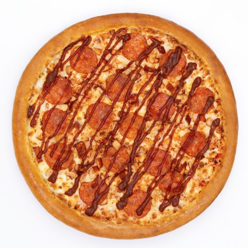 Золотистая основа, плавящийся сыр моцарелла, пикантная пепперони, ароматное копчёное куриное филе и горячий соус барбекю. Один кусочек — и вы почувствуете дух Америки!