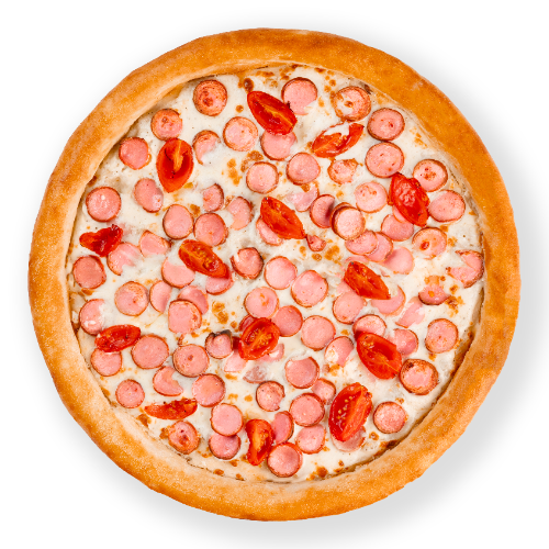 Яркая пицца Хот Дог: весёлое сочетание сосисок, сочных помидоров черри, аппетитной моцареллы и солнечного томатного соуса на хрустящей основе. Лучший выбор для маленьких непосед!
