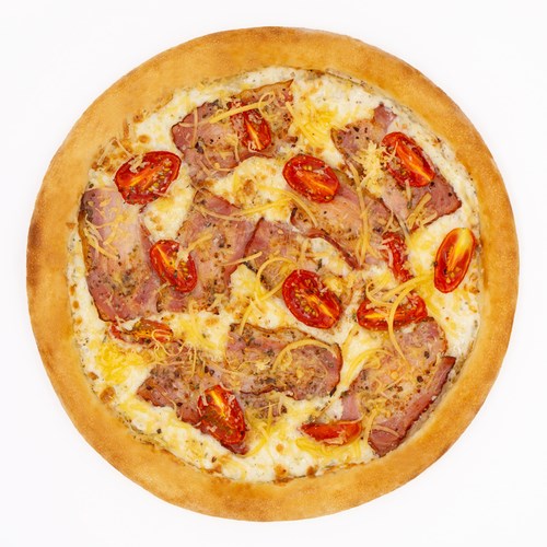 Любимая Карбонара — нежное тесто, тягучая моцарелла, сливочный сметанный соус, хрустящий бекон, зрелый пармезан, сочные помидоры черри и ароматные итальянские специи. Вкус паста карбонара в формате пиццы!