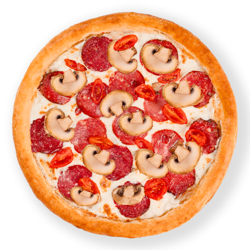 Золотистая корочка, томатный соус, терпкие копчёные колбаски, маленькие черри, свежие шампиньоны и расплавленная моцарелла. Традиционный вкус солнечной Неаполя в каждом кусочке!