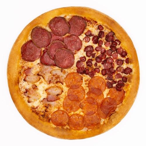 Трапеза Микс — хрустящее тесто, тягучая моцарелла, томатный соус, копчёные колбаски, ароматный бекон, острая пепперони и пикантные охотничьи колбаски. Настоящий пир для любителей мяса!