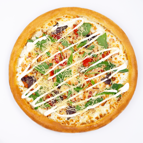 Пицца Цезарь — хрустящее тесто, копчёное куриное филе, салатный микс, сочные помидоры черри, насыщенный соус цезарь, нежная моцарелла и зернистый пармезан. Настоящий римский император в мире пицц!