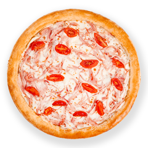 Легкая и нежная пицца Ветчина: воздушное тесто, кремово-сметанный соус, сочная ветчина, свежие помидорки черри и таящая моцарелла. Идеально сбалансированный вкус для любого случая!